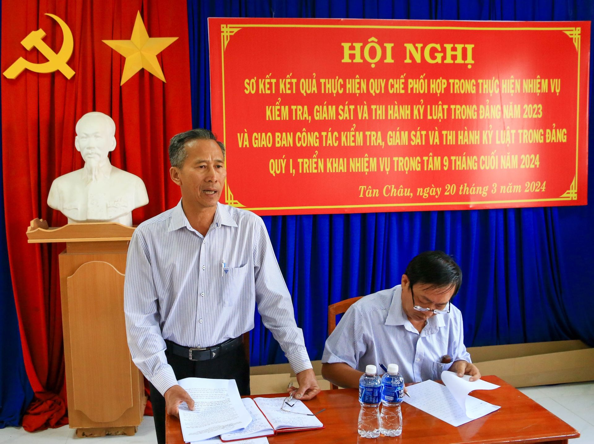 Ngày 20.3, Ủy ban kiểm tra (UBKT) Huyện ủy Tân Châu tổ chức hội nghị sơ kết kết quả thực hiện Quy chế phối hợp trong thực hiện nhiệm vụ kiểm tra, giám sát và thi hành kỷ luật trong Đảng năm 2023; giao ban quý 1 và triển khai nhiệm vụ trọng tâm 9 tháng cuối năm 2024. Ông Nguyễn Thành Hữu- Chủ nhiệm UBKT Huyện ủy chủ trì hội nghị.