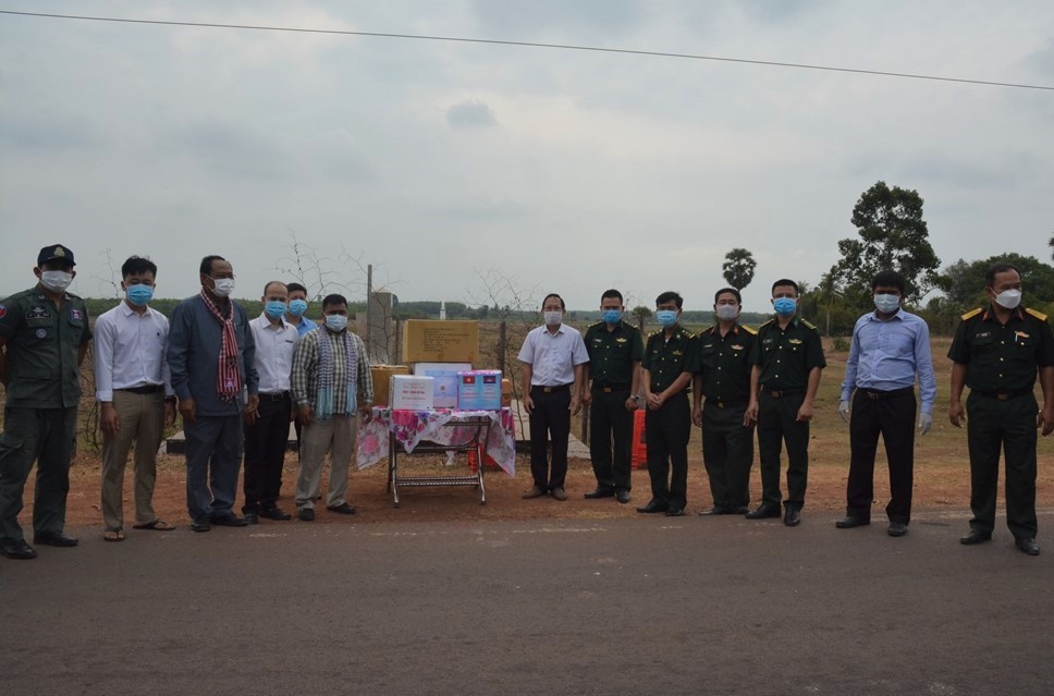 Tại đây, đoàn đã trao tặng 5.500 chiếc khẩu trang kháng khuẩn, 500 chai nước rửa tay diệt khuẩn cho lãnh đạo huyện Mê Mốt và đại diện tỉnh Tboung Khmum, Vương quốc campuchia.