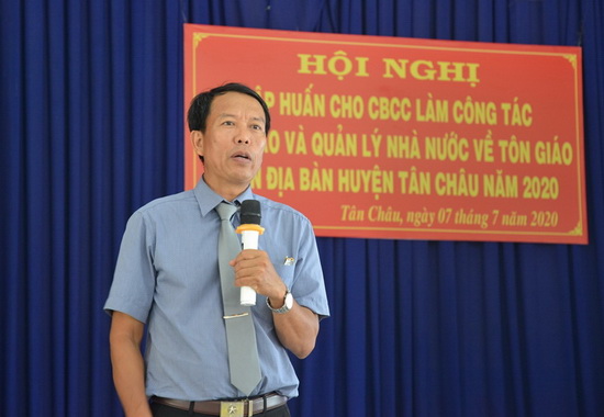 Sáng 7.7, Phòng Nội vụ huyện Tân Châu phối hợp với Ban Tôn giáo tỉnh khai giảng lớp tập huấn bồi dưỡng kiến thức tôn giáo cho cán bộ, công chức làm công tác tôn giáo cơ sở năm 2020.