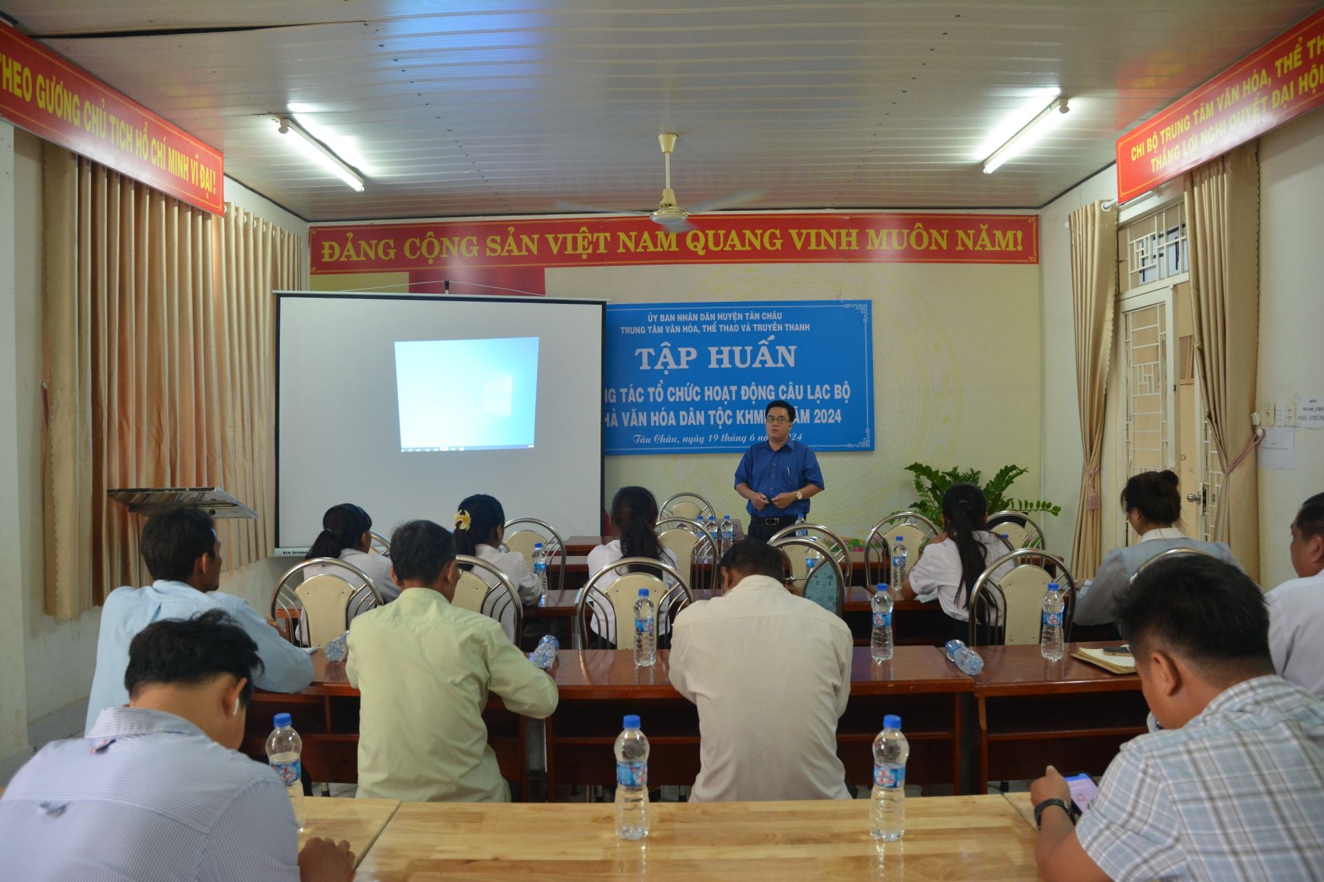 Trung tâm Văn hoá, Thể thao và Truyền thanh huyện Tân Châu vừa tổ chức tập huấn công tác tổ chức và hoạt động Câu lạc bộ Nhà văn hoá dân tộc Khmer, nhằm triển khai thực hiện có hiệu quả Dự án 6 về “Bảo tồn, phát huy giá trị văn hoá truyền thống tốt đẹp của các dân tộc thiểu số gắn với phát triển du lịch” giai đoạn 2023-2025 trên địa bàn huyện.