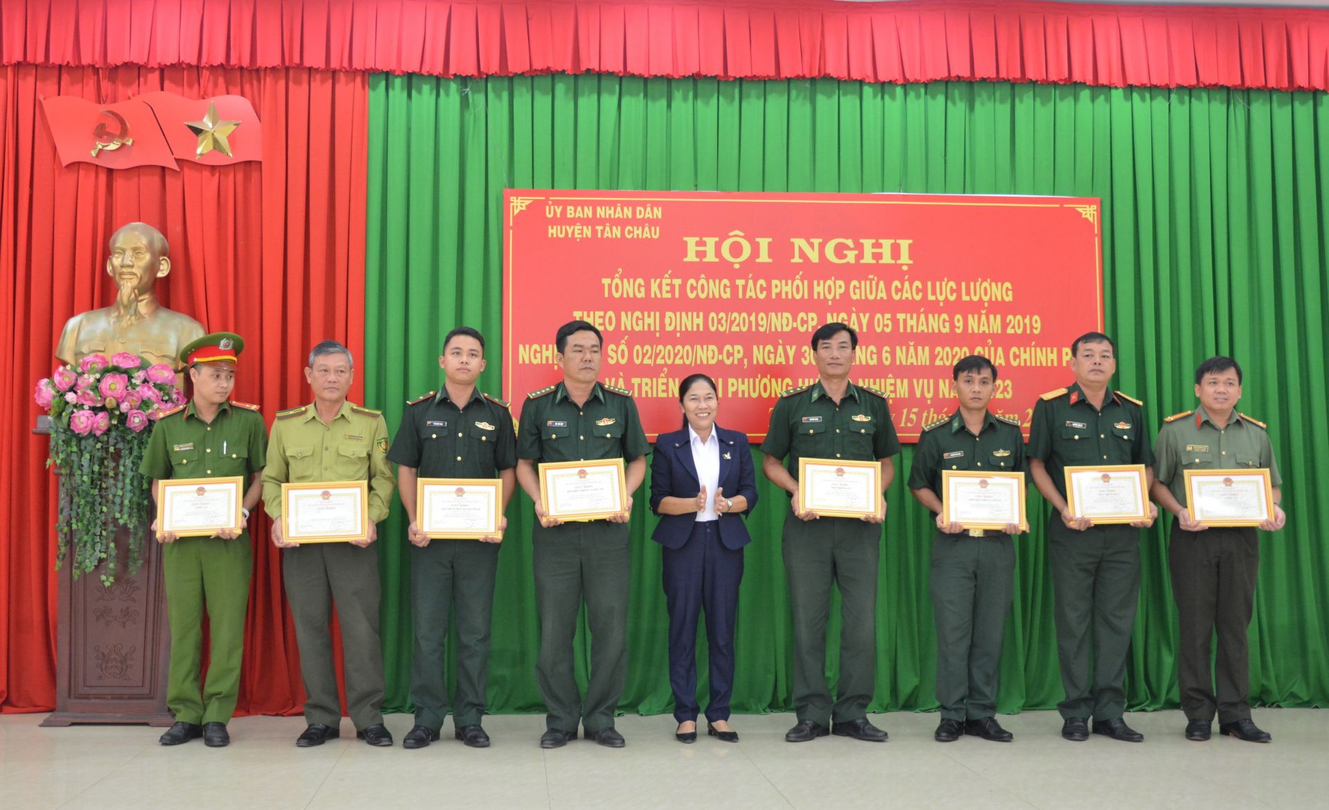 Dịp này, UBND huyện Tân Châu khen thưởng cho 8 tập thể và 17 cá nhân có thành tích tiêu biểu trong công tác phối hợp giữa các lực lượng theo nghị định số 03, 02 của Chính phủ trong năm 2022.
