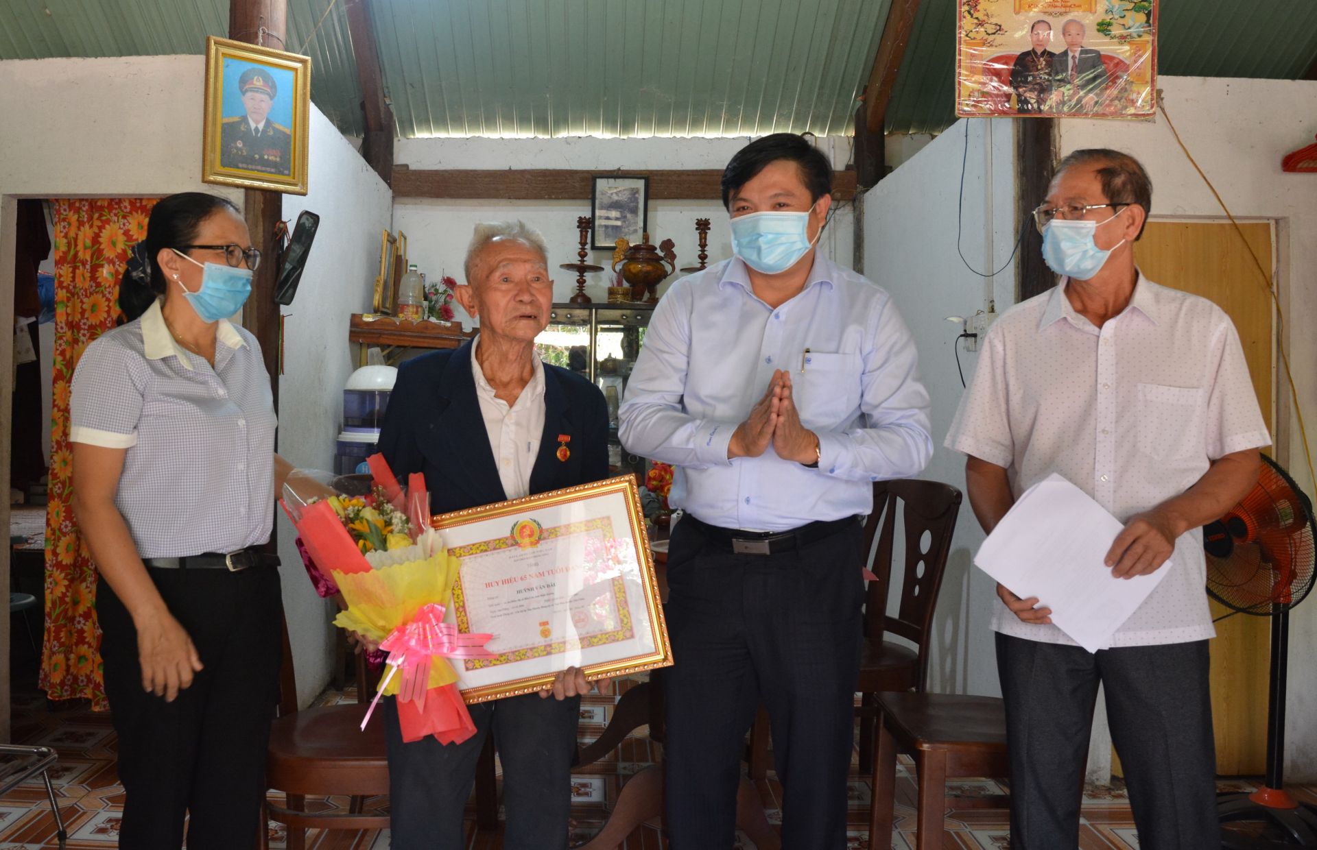 Trao huy hiệu 65 năm tuổi đảng cho đảng viên Huỳnh Văn Đâu.