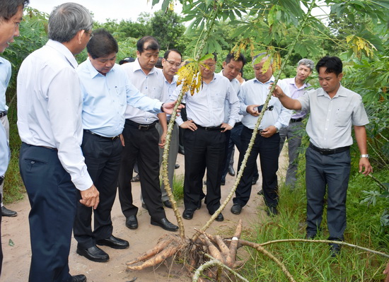 Thứ trưởng Bộ NN&PTNT Lê Quốc Doanh (thứ 2, từ trái qua) kiểm tra vùng nhân giống mì sạch bệnh ở huyện Tân Châu.