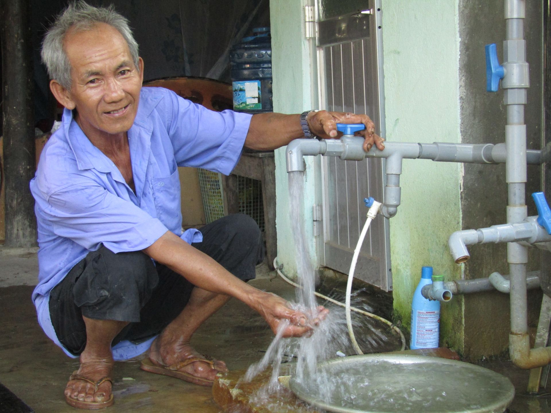 Người dân xã Hoà Thạnh, huyện Châu Thành sử dụng nước trong sinh hoạt gia đình.