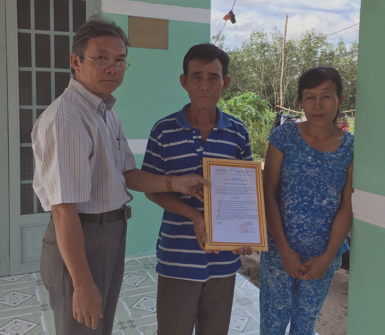| UBND xã Thái Bình trao quyết định bàn giao nhà đại đoàn kết cho gia đình ông Lý Thành Ân. |