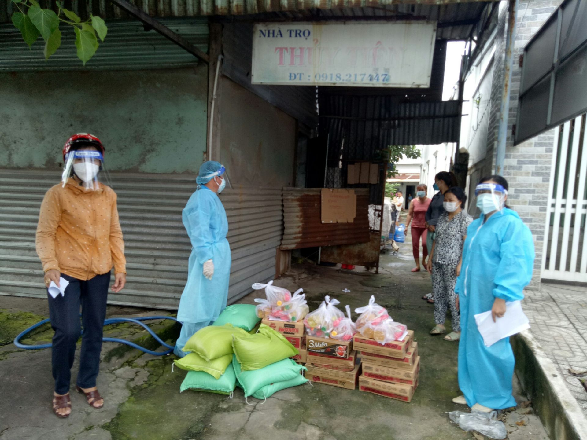Bà Phan Thị Hồng Đào – Phó Chủ tịch Liên đoàn lao động tỉnh Tây Ninh (người đứng bên trái hàng thứ 2) và bà Nguyễn Thị Kim Liên – Chủ tịch Công đoàn khu kinh tế tỉnh Tây Ninh (người đứng hàng thứ nhất) thăm, tặng quà cho công nhân, người lao động tại nhà trọ Thông Thảo, phường An Tịnh, thị xã Trảng Bàng