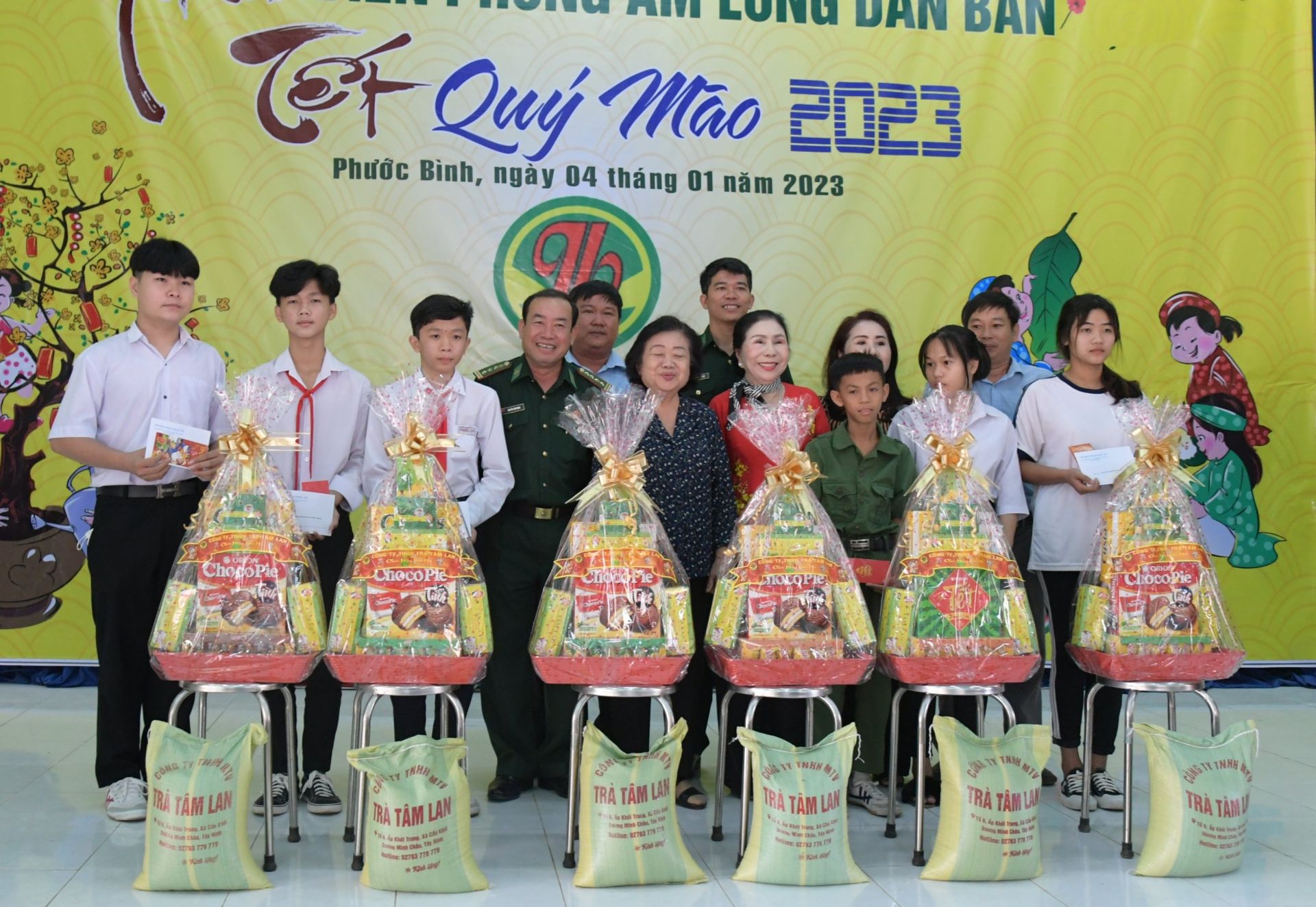 Bà Trương Mỹ Hoa cùng Chỉ huy BĐBP tỉnh và Giám đốc Công ty TNHH MTV Trà Tâm Lan trao tặng 40 phần quà cho các cựu chiến binh và 100 phần quà cho các gia đình có hoàn cảnh khó khăn, các em học sinh nghèo hiếu học do Đồn Biên phòng Phước Chỉ nhận đỡ đầu trong chương trình “Nâng bước em đến trường” và “Con nuôi đồn biên phòng”.