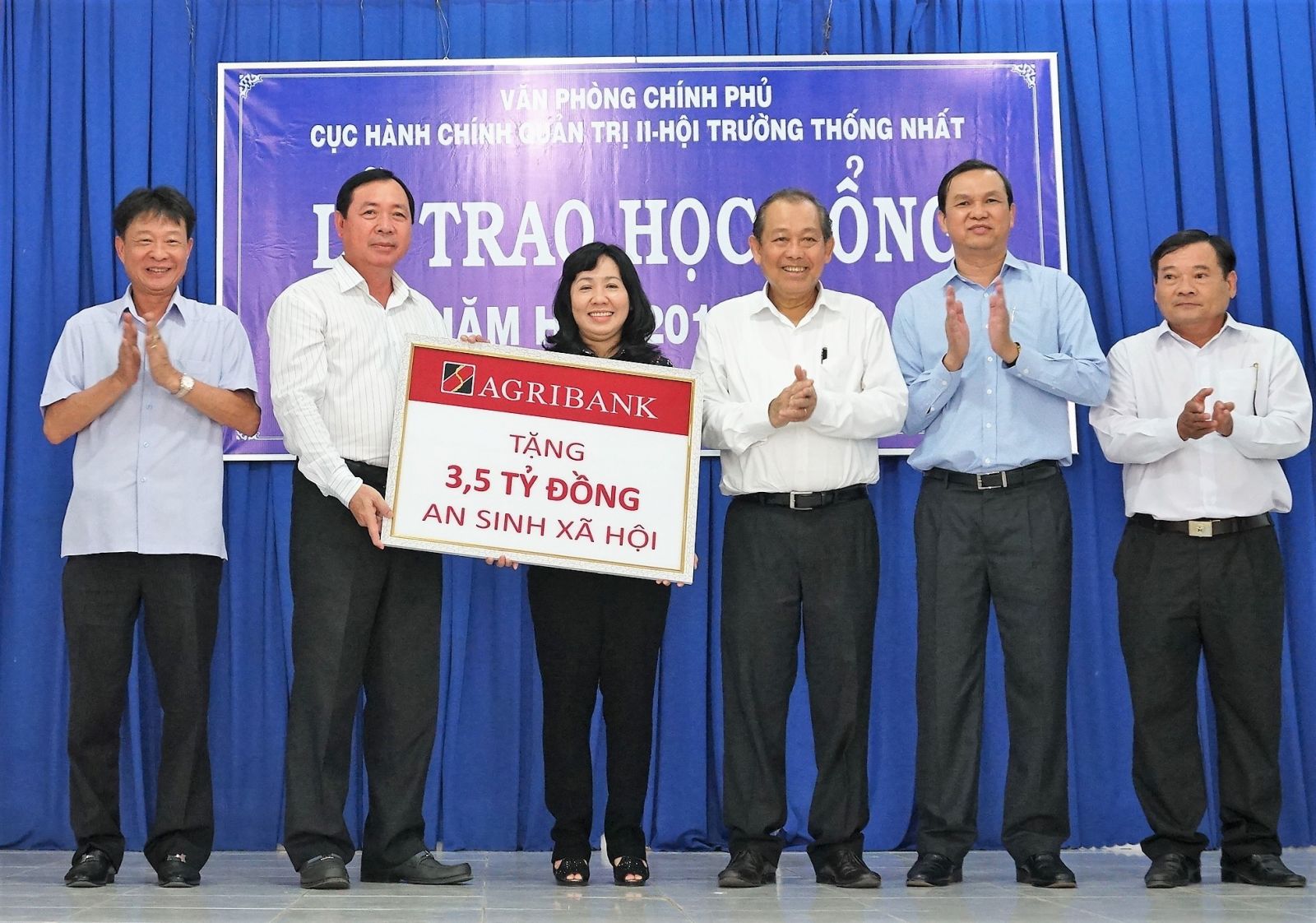 Phó Thủ tướng Chính phủ Trương Hoà Bình (thứ ba, bên phải) và các thành viên trong đoàn tặng biển tượng trưng 3,5 tỷ đồng xây dựng nhà đại đoàn kết.