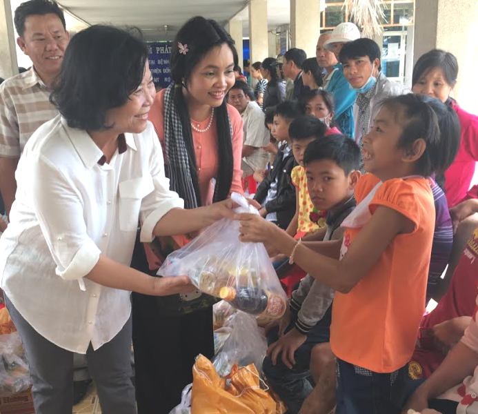 Bà Võ Thị Đẹp – Chủ tịch Hội nạn nhân chất độc da cam/dioxin tỉnh Tây Ninh cùng chủ nhiệm CLB từ thiện Đồng Tâm tặng quà cho trẻ khuyết tật.
