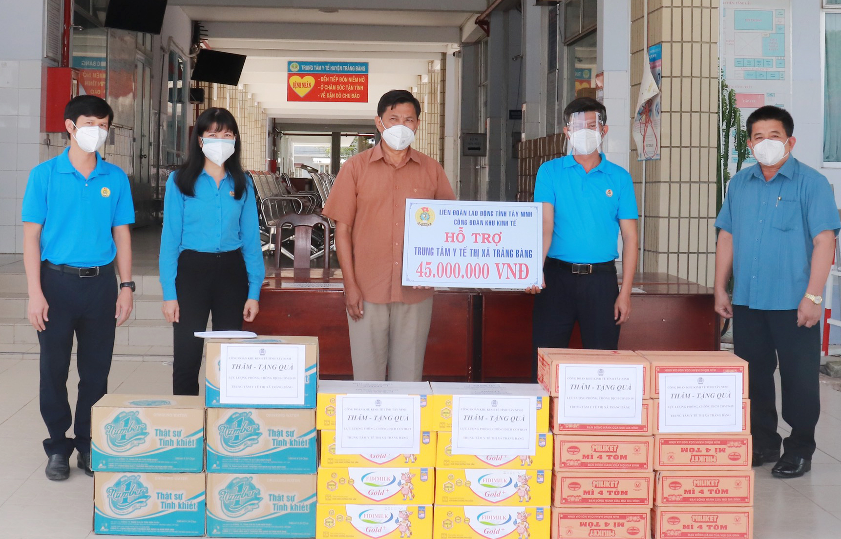 Dịp này, Công đoàn Khu Kinh tế tỉnh tặng quà hỗ trợ lực lượng phòng, chống dịch tại Trung tâm Y tế thị xã Trảng Bàng số tiền 45 triệu đồng cùng với một số nhu yếu phẩm như sữa, mì tôm, nước suối.