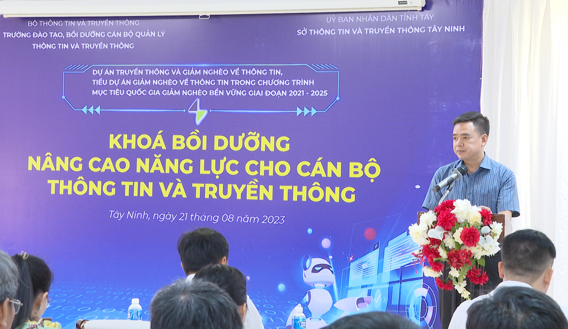 Phát biểu khai giảng lớp học, Phó Hiệu trưởng Trường Đào tạo, bồi dưỡng cán bộ quản lý thông tin và truyền thông Lê Ngọc Bảo nhấn mạnh, khoá bồi dưỡng nâng cao năng lực cho cán bộ Thông tin và Truyền thông tại Tây Ninh trong khuôn khổ của Dự án Truyền thông và giảm nghèo về thông tin thuộc Chương trình mục tiêu quốc gia giảm nghèo bền vững giai đoạn 2021-2025.