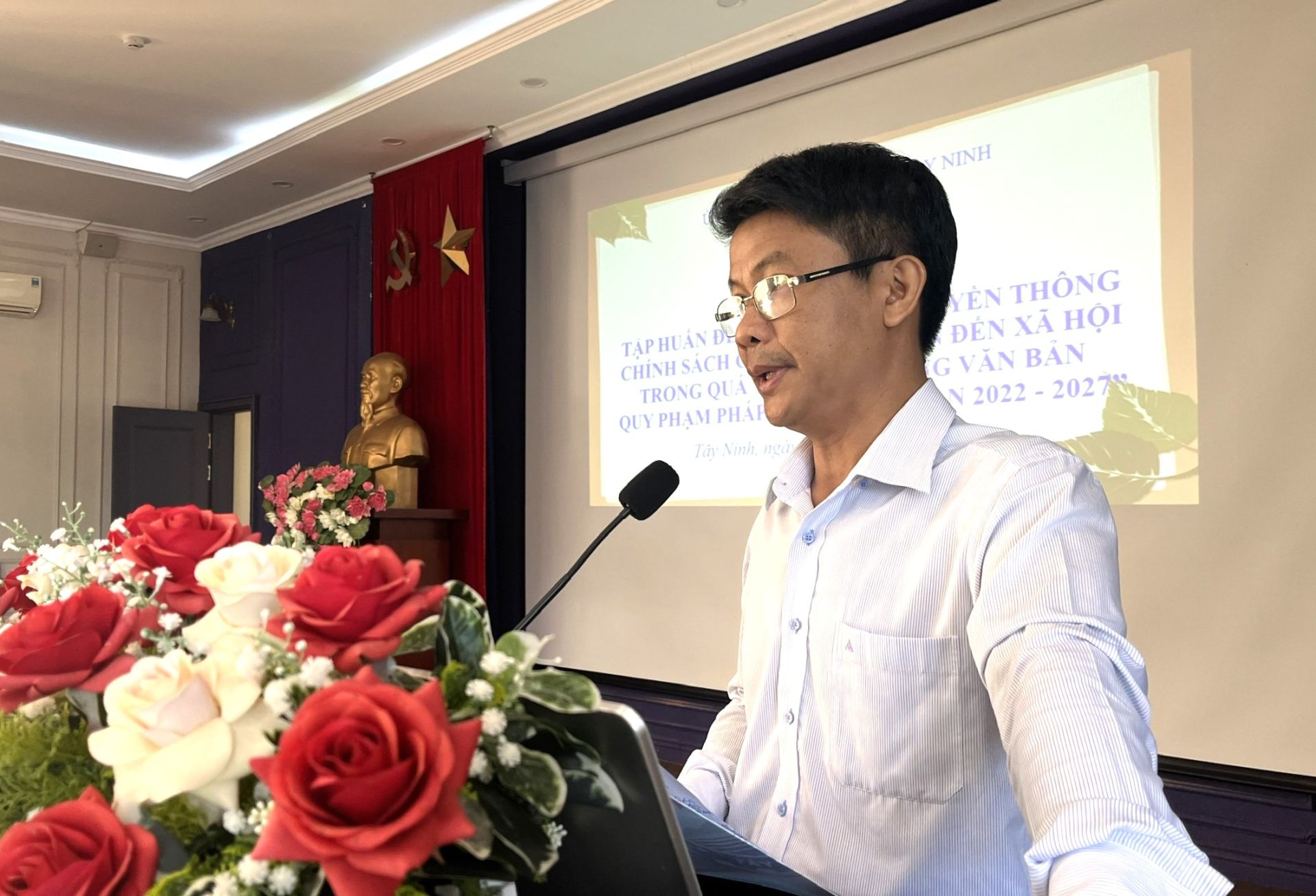 Đại diện Sở Tư pháp triển khai nội dung Quyết định số 407/QĐ-TTg ngày 30.3.2022 của Thủ tướng Chính phủ phê duyệt Đề án “Tổ chức truyền thông chính sách có tác động lớn đến xã hội trong quá trình xây dựng văn bản quy phạm pháp luật giai đoạn 2022-2027”; Quyết định số 1255/QĐ-UBND ngày 6.6.2022 của UBND tỉnh Tây Ninh về việc ban hành Kế hoạch thực hiện Đề án “Tổ chức truyền thông chính sách có tác động lớn đến xã hội trong quá trình xây dựng văn bản quy phạm pháp luật giai đoạn 2022-2027” trên địa bàn tỉnh Tây Ninh; chỉ thị số 07/CT-TTg ngày 21.3.2023 của Thủ tướng Chính phủ về tăng cường công tác truyền thông chính sách; Kế hoạch số 3668/KH-UBND ngày 13.11.2023 của UBND tỉnh Tây Ninh về việc triển khai Chỉ thị số 07/CT-TTg ngày 21.3.2023 của Thủ tướng Chính phủ về tăng cường công tác truyền thông chính sách trên địa bàn tỉnh.