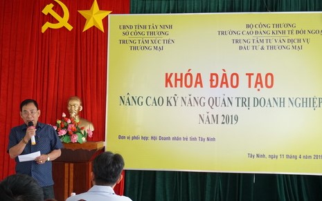 Ngày 10.4, Trung tâm Xúc tiến Thương mại và Hội Doanh nhân trẻ Tây Ninh phối hợp Trung tâm Tư vấn dịch vụ đầu tư và thương mại (Trường Cao đẳng Kinh tế đối ngoại) tổ chức lớp tập huấn năng cao kỹ năng quản trị doanh nghiệp cho doanh nghiệp vừa và nhỏ hoạt động trên địa bàn tỉnh.