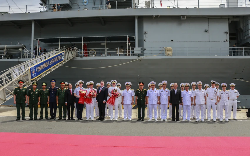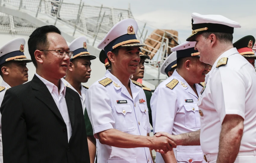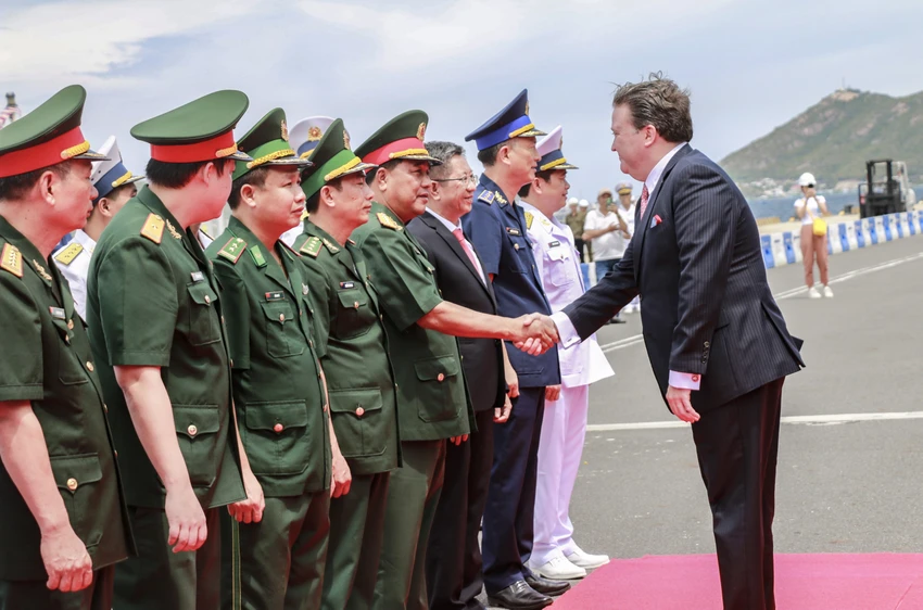 Tham dự lễ đón có lãnh đạo Vùng 4 Hải quân, Vùng Cảnh sát biển 3, Sở Ngoại vụ tỉnh Khánh Hòa. Phía Hoa Kỳ có Đại sứ tùy viên quốc phòng Hoa Kỳ và một số quan chức Đại sứ quán Hoa Kỳ tại Việt Nam. Trong ảnh: Ông Marc Knapper, Đại sứ Hoa Kỳ tại Việt Nam bắt tay lãnh đạo đoàn phía Việt Nam.