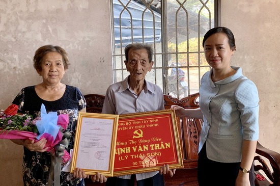 Bà Nguyễn Thị Thu Hiền-Bí thư Huyện ủy Châu Thành tặng khánh mừng thọ cho đảng viên. Ảnh minh họa