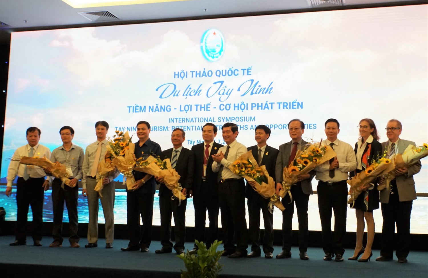 | Thứ trưởng Bộ VHTT&DL Huỳnh Vĩnh Ái cùng lãnh đạo tỉnh Tây Ninh tặng hoa cho các chuyên gia tham dự hội thảo. |