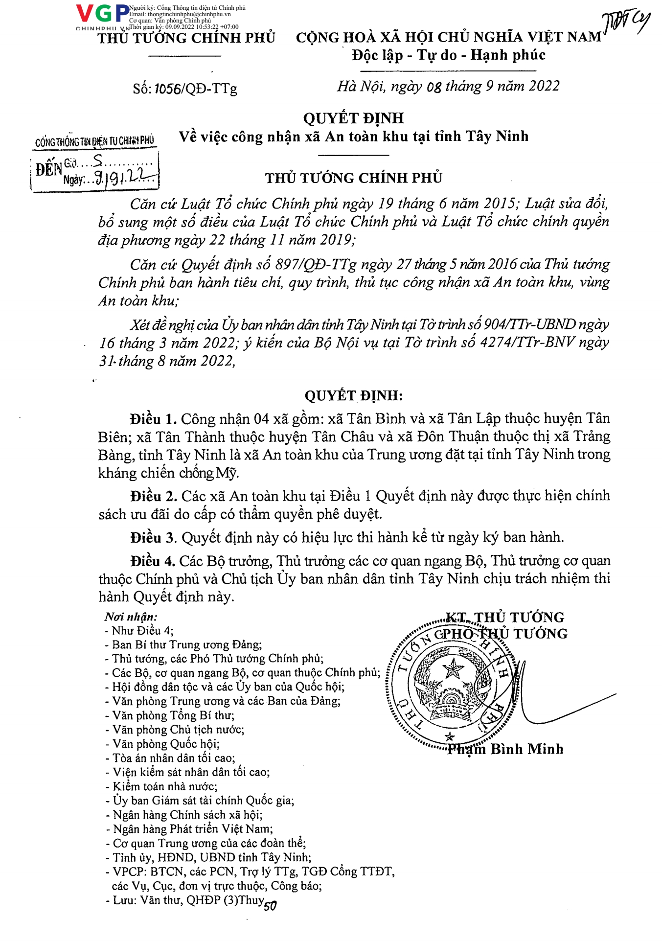 Ngày 8.9, Phó Thủ tướng Thường trực Phạm Bình Minh ký Quyết định số 1056/QĐ-TTg công nhận 4 xã: Tân Bình và Tân Lập thuộc huyện Tân Biên; Tân Thành thuộc huyện Tân Châu và Đôn Thuận thuộc thị xã Trảng Bàng là xã An toàn khu của Trung ương đặt tại tỉnh Tây Ninh trong kháng chiến chống Mỹ.
