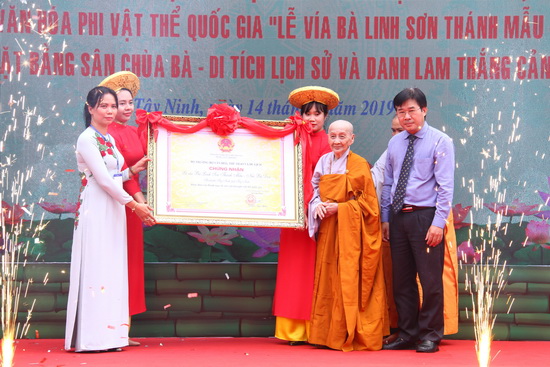 Ông Nông Quốc Thành- Phó Cục trưởng Cục DSVH – Bộ VHTTDL trao Bằng công nhận Di sản văn hóa phi vật thể quốc gia “Lễ vía bà Linh Sơn Thánh Mẫu - núi Bà Đen” cho lãnh đạo TP. Tây Ninh và Ni trưởng Thích Nữ Diệu Nghĩa.