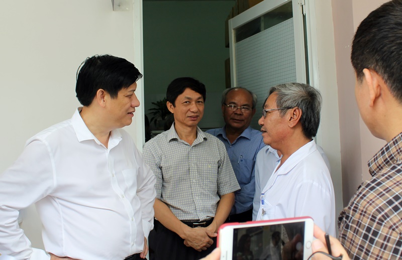 | Thứ trưởng Bộ Y tế Nguyễn Thanh Long (trái) thăm hỏi lãnh đạo và cán bộ Trung tâm Y tế Hoà Thành. |