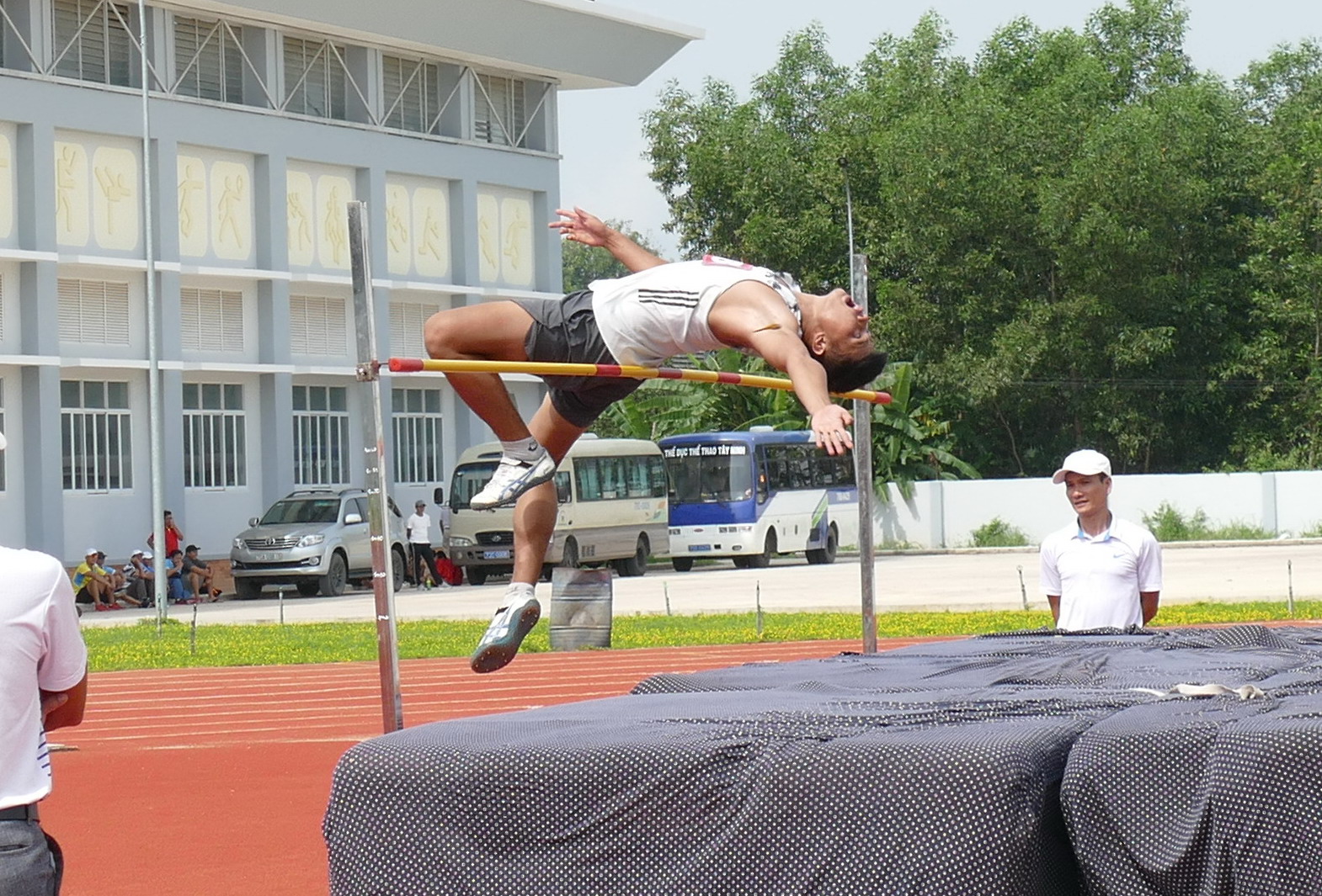 Cú bay người qua mức xà 1m80 của VĐV Nguyễn Minh Kiệt (Tây Ninh), giành HCB nhảy cao nam hệ trẻ.