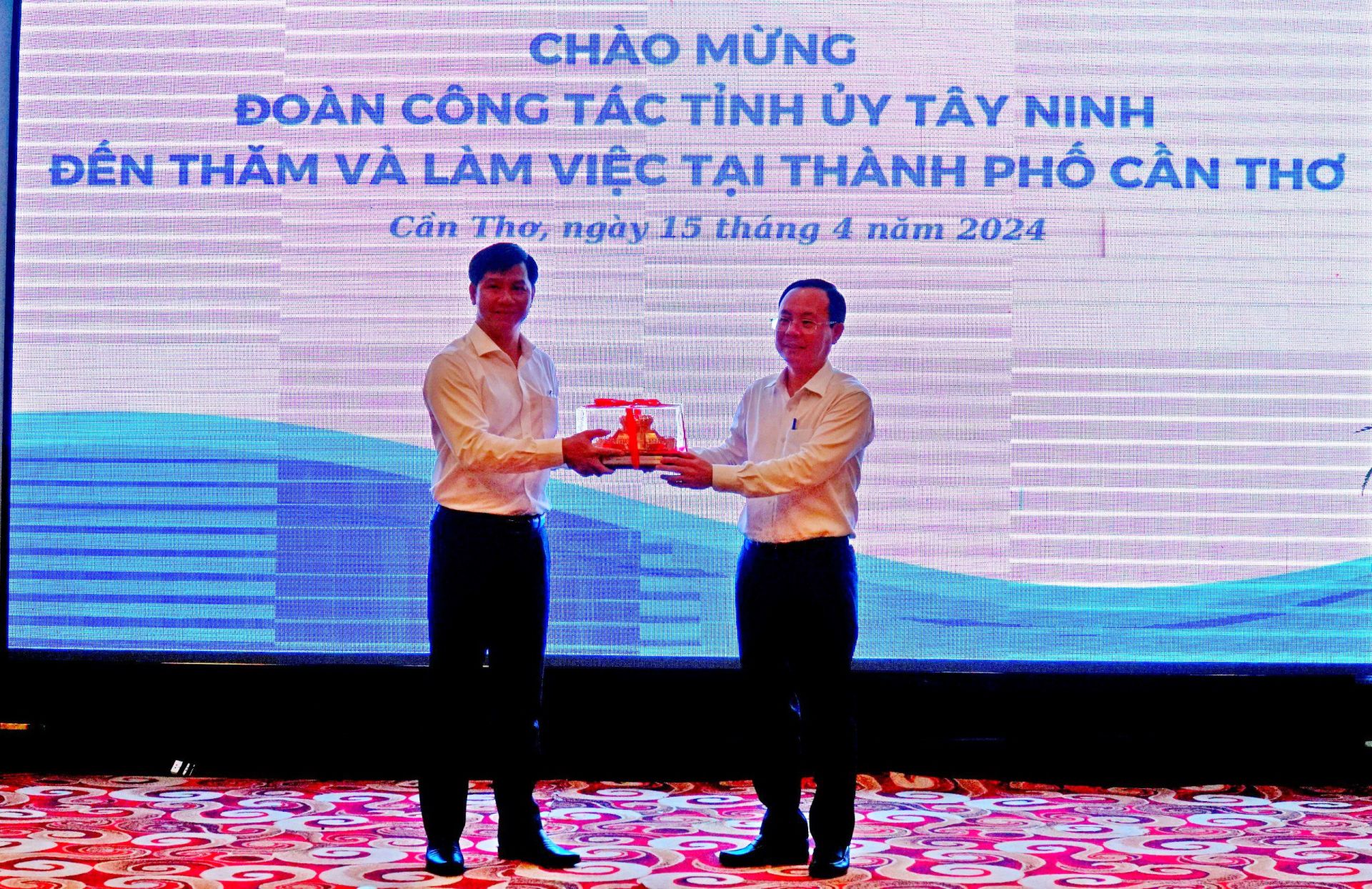 Ông Nguyễn Văn Hiếu- Bí thư Thành uỷ Cần Thơ tặng quà lưu niệm cho ông Nguyễn Thành Tâm- Bí thư Tỉnh uỷ Tây Ninh.