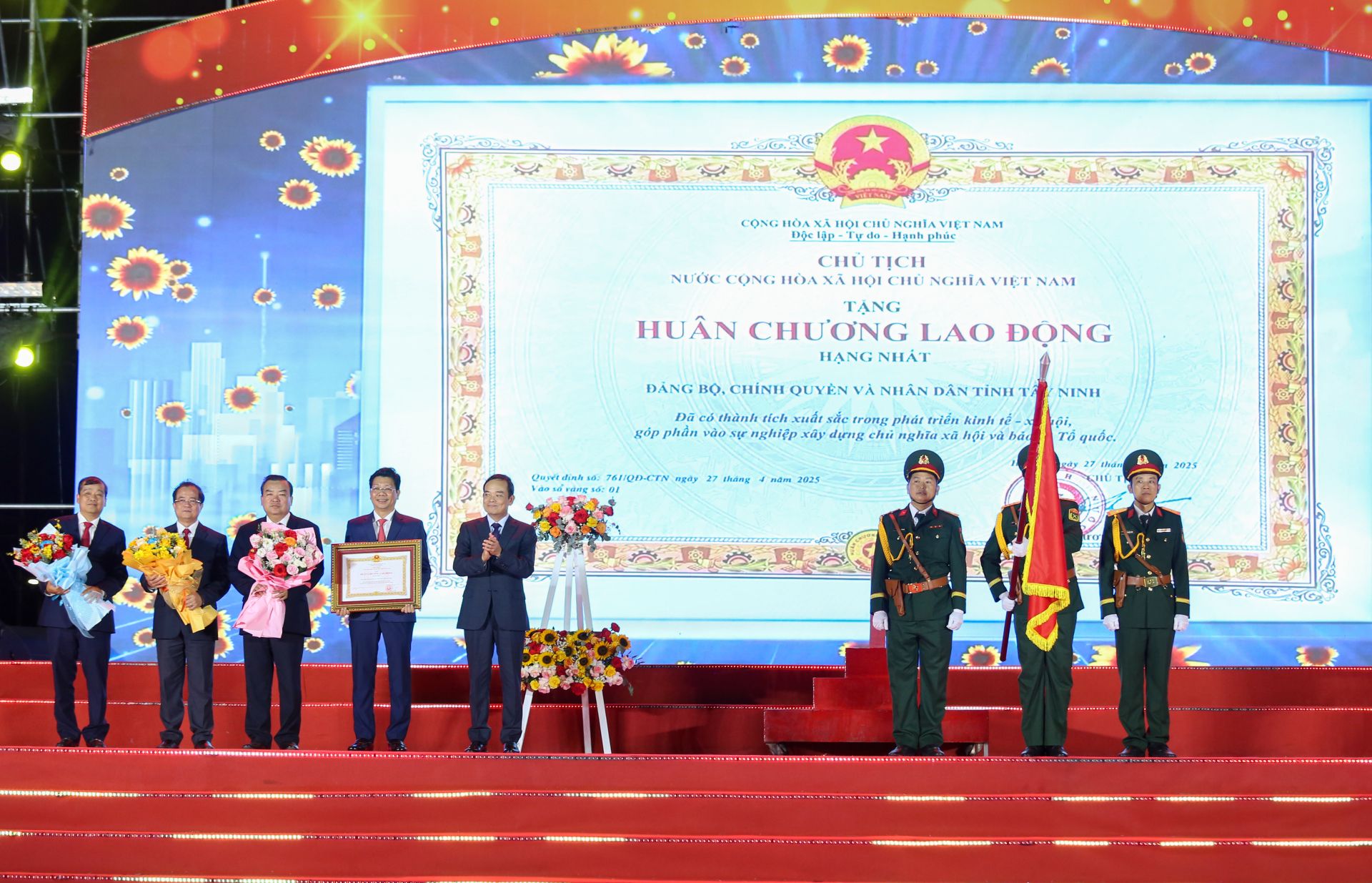 Tại buổi lễ, ông Trần Lưu Quang- Bí thư Trung ương Đảng, Trưởng Ban Chính sách, Chiến lược Trung ương trao tặng Huân chương Lao động hạng Nhất của Chủ tịch nước Cộng hoà Xã hội chủ nghĩa Việt Nam cho Đảng bộ, Chính quyền và Nhân dân tỉnh Tây Ninh.