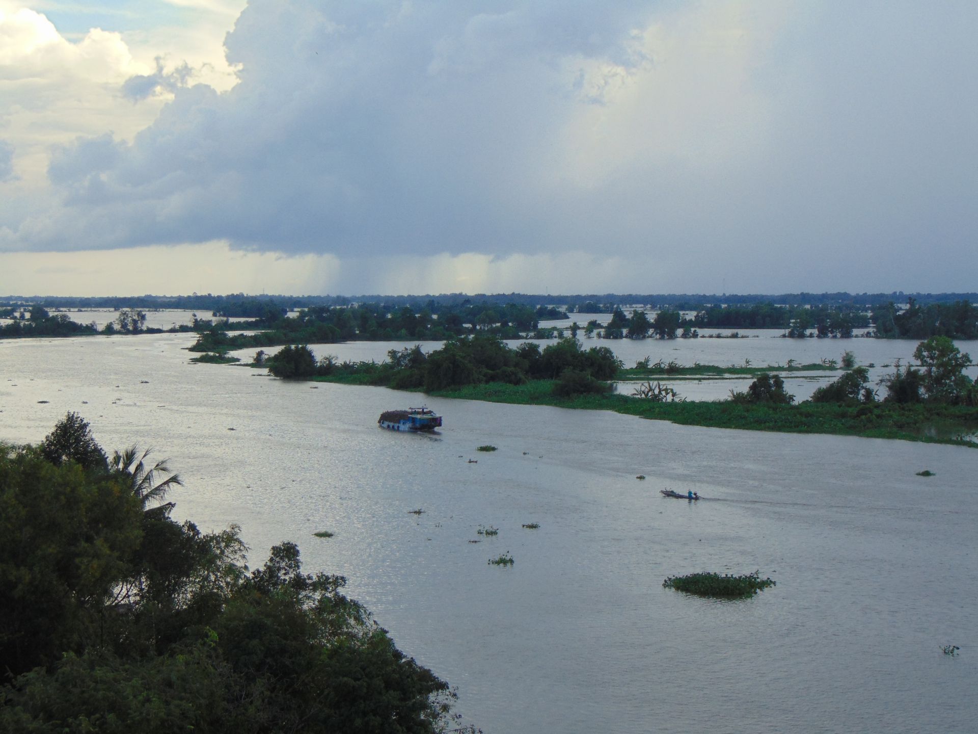 Có gì mà thăm thú nhỉ? Tôi tự hỏi khi phà đã ra đến giữa sông, giữa mênh mông trời nước. Chẳng còn biết đâu là sông, đâu là ruộng nữa khi nước tràn bờ. Cũng có thể nhận ra bờ bởi những hàng cây chồi phơ phất giữa một dải lục bình còn quyến luyến bờ sông chưa muốn trôi đi. Cũng có khi bờ là một rặng cây cao ngất, giờ đã trở nên bơ vơ giữa nền trời trống hoác. Chỉ trong thoáng chốc, cây cầu Bến Sỏi luôn có xe chạy qua nay đã thành mỏng manh như một nét mày.