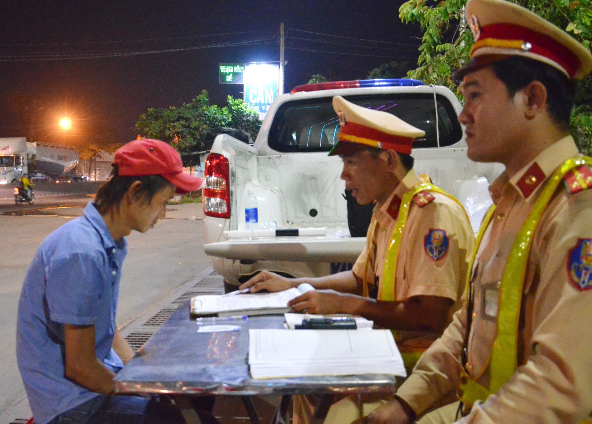 Tối 22.1, Phòng Cảnh sát giao thông-Công an Tây Ninh phối hợp cùng lực lượng Cảnh sát Cơ động, Cảnh sát phòng chống ma túy và lực lượng công an huyện Trảng Bàng thực hiện kiểm tra chuyên đề đối với các tài xế xe tải và xe đầu kéo container tại khu vực Suối Sâu, huyện Trảng Bàng, tỉnh Tây Ninh.