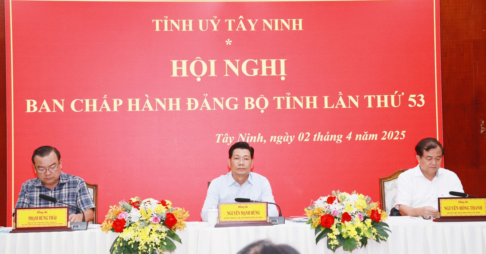 Bí thư Tỉnh uỷ, Chủ tịch HĐND tỉnh Nguyễn Mạnh Hùng; Phó Bí thư Thường trực Tỉnh uỷ, Trưởng đoàn ĐBQH tỉnh Phạm Hùng Thái và Quyền Chủ tịch UBND tỉnh Nguyễn Hồng Thanh chủ trì hội nghị.