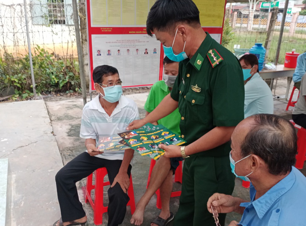 Đại tá Lê Hồng Vương chỉ đạo, trên địa bàn ngoại biên tiếp giáp huyện Châu Thành vừa phát hiện có ca dương tính với Covid-19, người này làm nghề buôn bán dọc biên giới, hiện phía Campuchia đang điều tra, truy vết, ngăn chặn. do vậy ông đề nghị các tổ chốt, sau khi hoàn thành việc bầu cử, tiếp tục nâng cao tinh thần cảnh giác cao độ, duy trì các chế độ trực sẵn sàng chiến đấu, siết chặt an ninh vùng biên, không để sót lọt người nhập cảnh trái phép qua biên giới. Ảnh: Trung Quân.