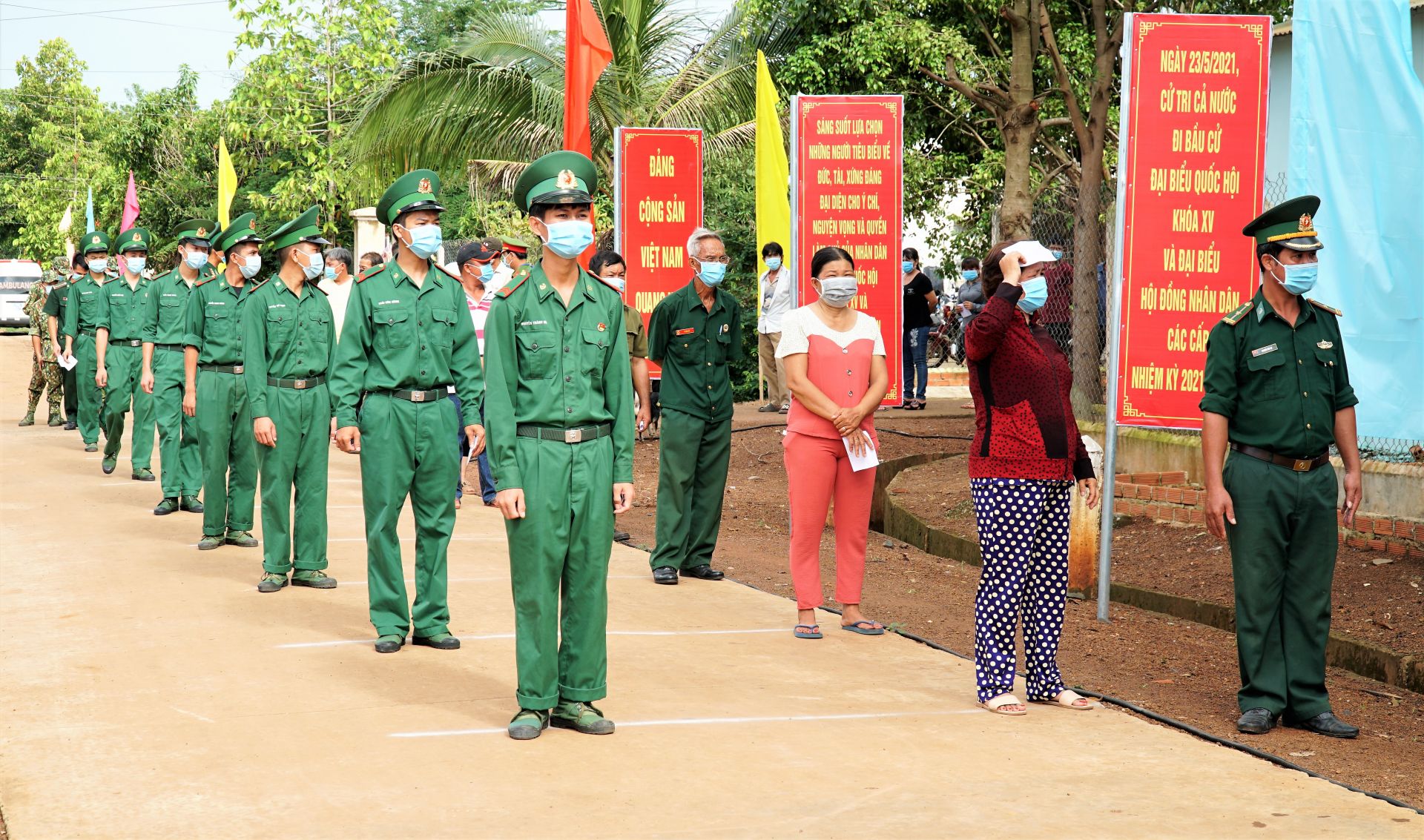 Cử tri Khu dân cư biên giới Chàng Riệc, ấp Tân Khai, xã Tân Lập, huyện Tân Biên chấp hành quy định phòng chống dịch, bảo đảm giãn cách. Ảnh: Tâm Giang.