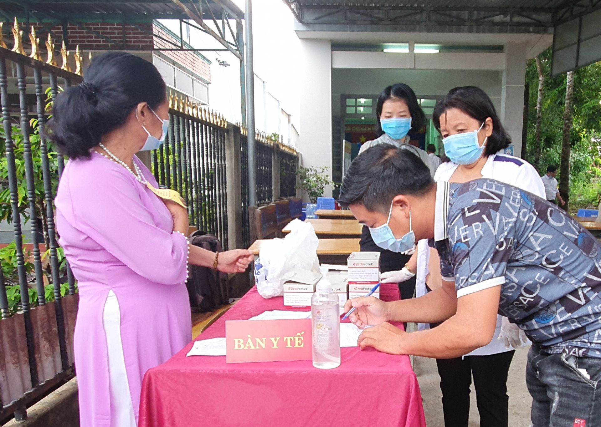 Cử tri khai báo y tế phòng, chống dịch trước khi vào nhận phiếu bầu tại khu vực bầu cử số 696, Văn phòng ấp Bình Trung, xã Bình Minh, TP. Tây Ninh. Ảnh: Minh Dương.