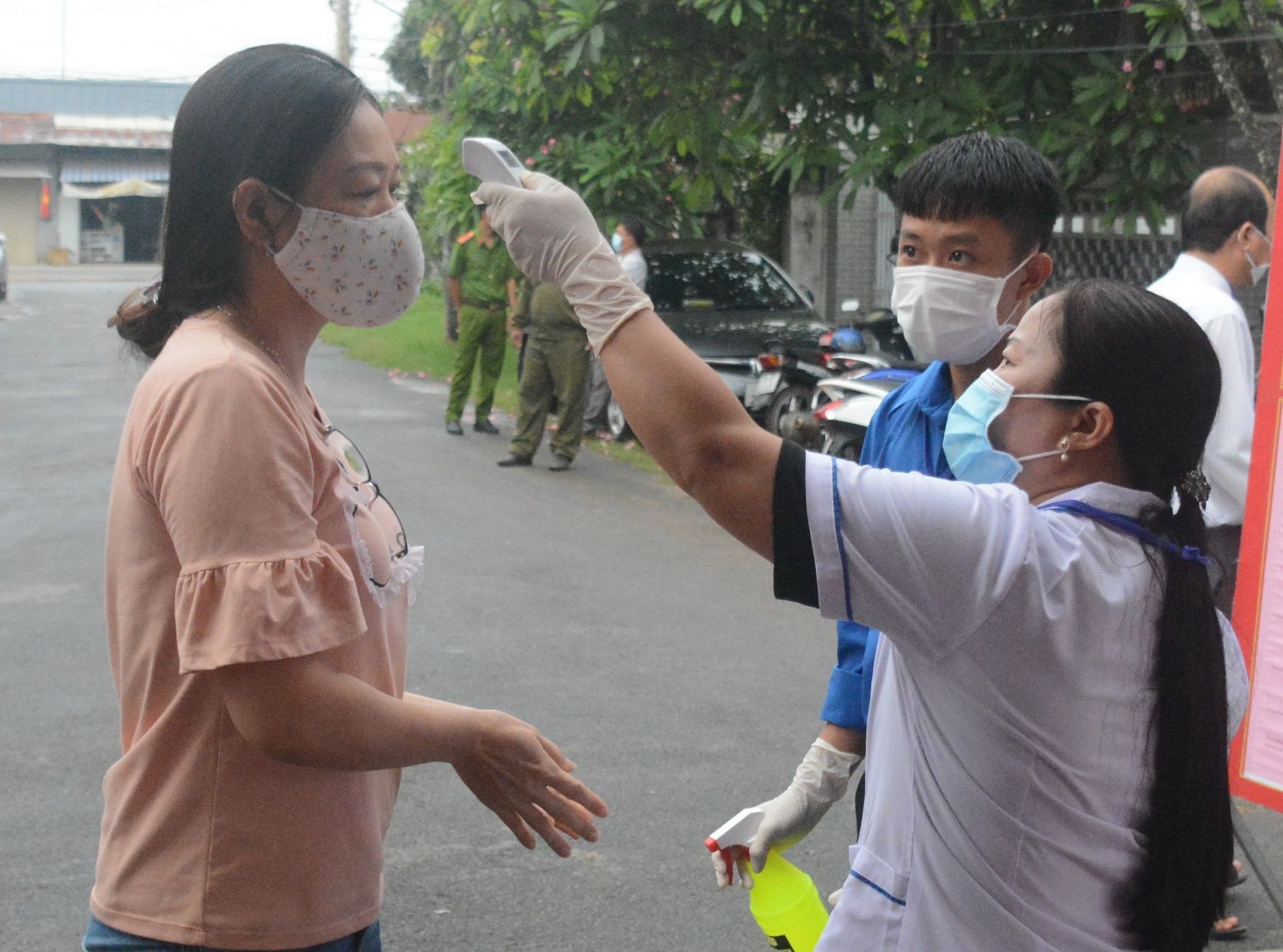 Nhân viên Y tế và đoàn viên thanh niên tình nguyện “trực chiến” đo thân nhiệt và sát khuẩn tay cho cử tri tại tổ bầu cử số 247, ấp Bình Phong, xã Thái Bình, huyện Châu Thành. Ảnh: Đ.V.T