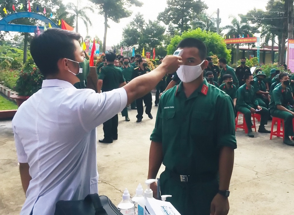 Việc đo thân nhiệt được thực hiện nghiêm tại Sư đoàn 5. Ảnh: Hoàng Danh.