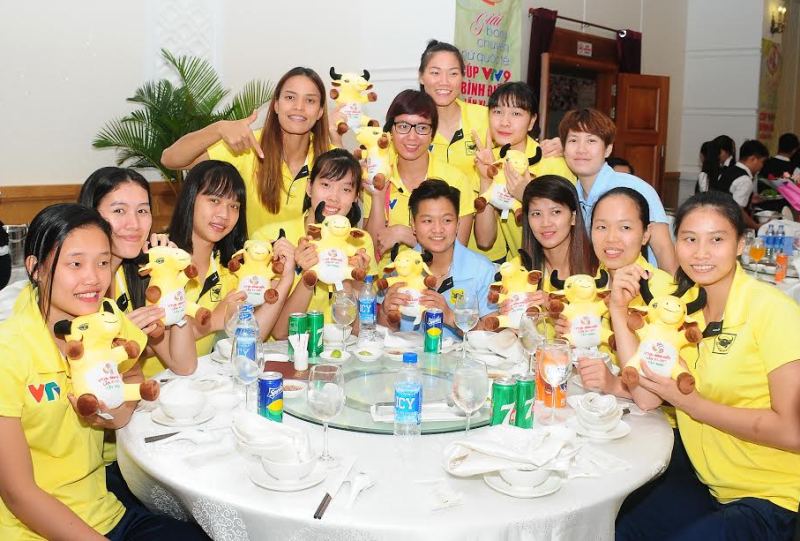 Các cầu thủ đội VTV Bình Điền Long An tại buổi tiệc chiêu đãi. |