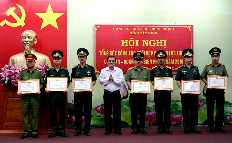 Hôm 22.2, 3 lực lượng Công an, Quân sự, Biên phòng tỉnh Tây Ninh tổ chức hội nghị tổng kết công tác phối hợp trong thực hiện nhiệm vụ bảo vệ an ninh quốc gia, giữ gìn trật tự, an toàn xã hội và nhiệm vụ quốc phòng năm 2016.