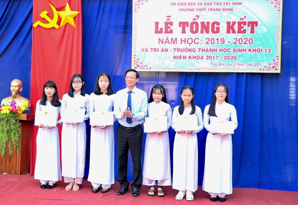 * Tại Trảng Bàng, Chủ tịch UBND thị xã Trần Anh Minh đã đến dự lễ và phát thưởng cho học sinh, giáo viên Trường THPT Trảng Bàng.