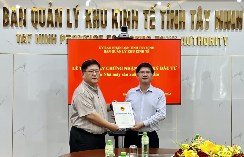 Ông Lê Thanh Kiệt- Phó trưởng Ban, Phụ trách Ban Quản lý Khu kinh tế Tây Ninh trao giấy chứng nhận đăng ký đầu tư dự án nhà máy sản xuất thực phẩm.