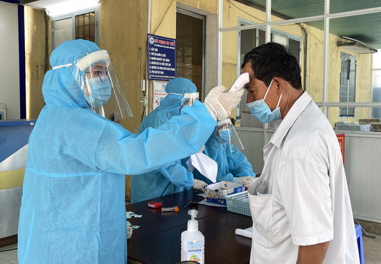 Người dân thực hiện đo thân nhiệt trước khi vào Bệnh viện Đa khoa tỉnh.