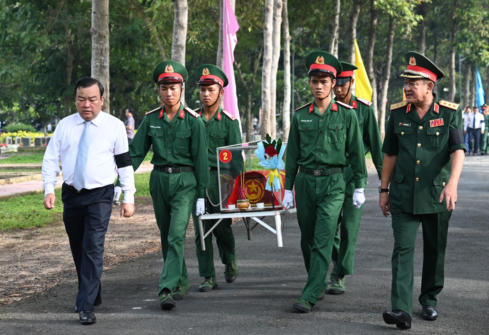 Phó Bí thư Thường trực Tỉnh uỷ Phạm Hùng Thái và Thượng tướng Võ Minh Lương tiễn đưa hài cốt liệt sĩ về nơi an táng.