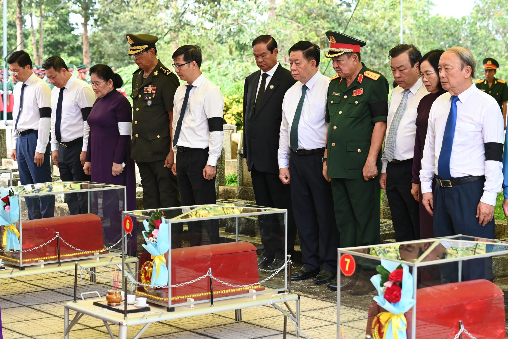 Các vị lãnh đạo thành kính mặc niệm, dâng hoa, thắp hương tưởng nhớ hương hồn những anh hùng liệt sĩ đã ngã xuống vì độc lập dân tộc, thống nhất đất nước, vì sự toàn vẹn lãnh thổ và đoàn kết quốc tế; đồng thời làm lễ truy điệu, an táng 172 hài cốt liệt sĩ tại Nghĩa trang liệt sĩ Đồi 82.