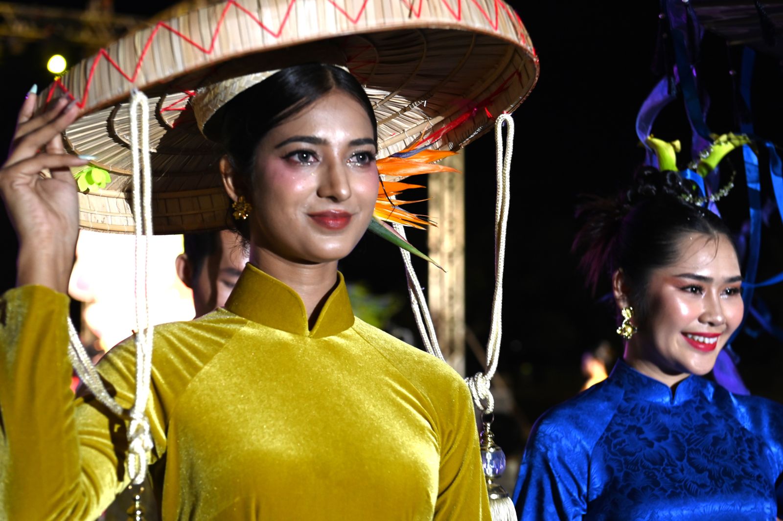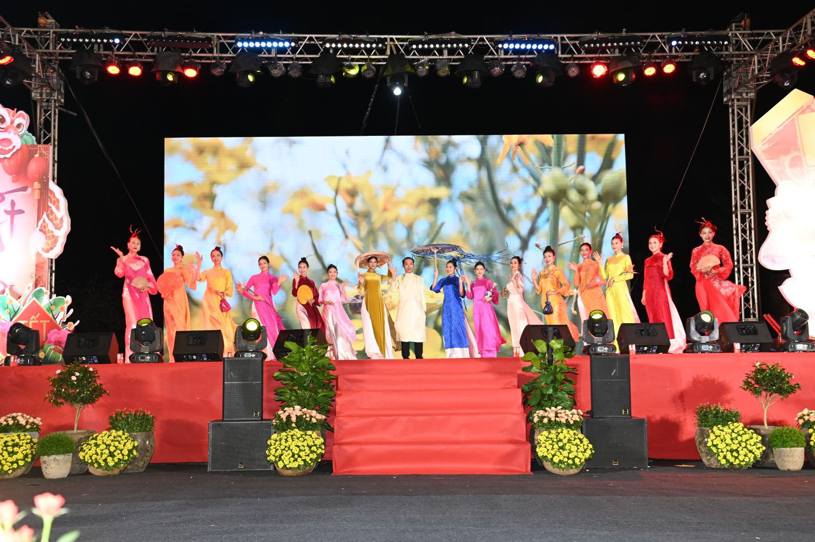 Điểm nhấn của chương trình là màn trình diễn thời trang áo dài độc đáo với chủ đề “Sắc hương xuân” của nhà thiết kế Tân Lê. Đặc biệt có sự tham gia của Hoa hậu Hoàn vũ Lào Soliya Bounsayngam, Miss Celeste India 2024 - Á hậu Siêu toàn cầu quốc tế 2024 Sangeeta Rani.