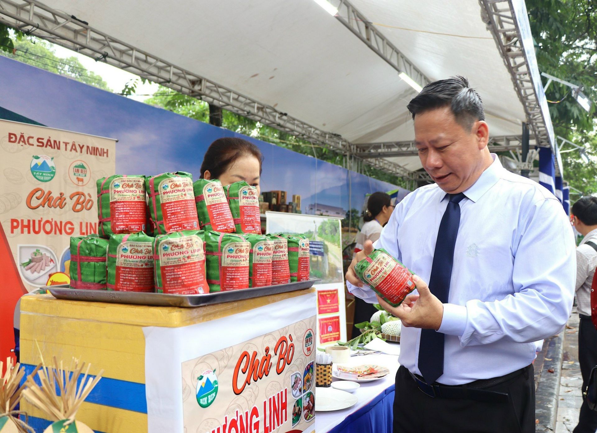 Ông Nguyễn Thanh Ngọc- Chủ tịch UBND tỉnh tham quan gian hàng chả bò Phương Linh tại sự kiện "Ngày Tây Ninh tại Hà Nội" năm 2023.