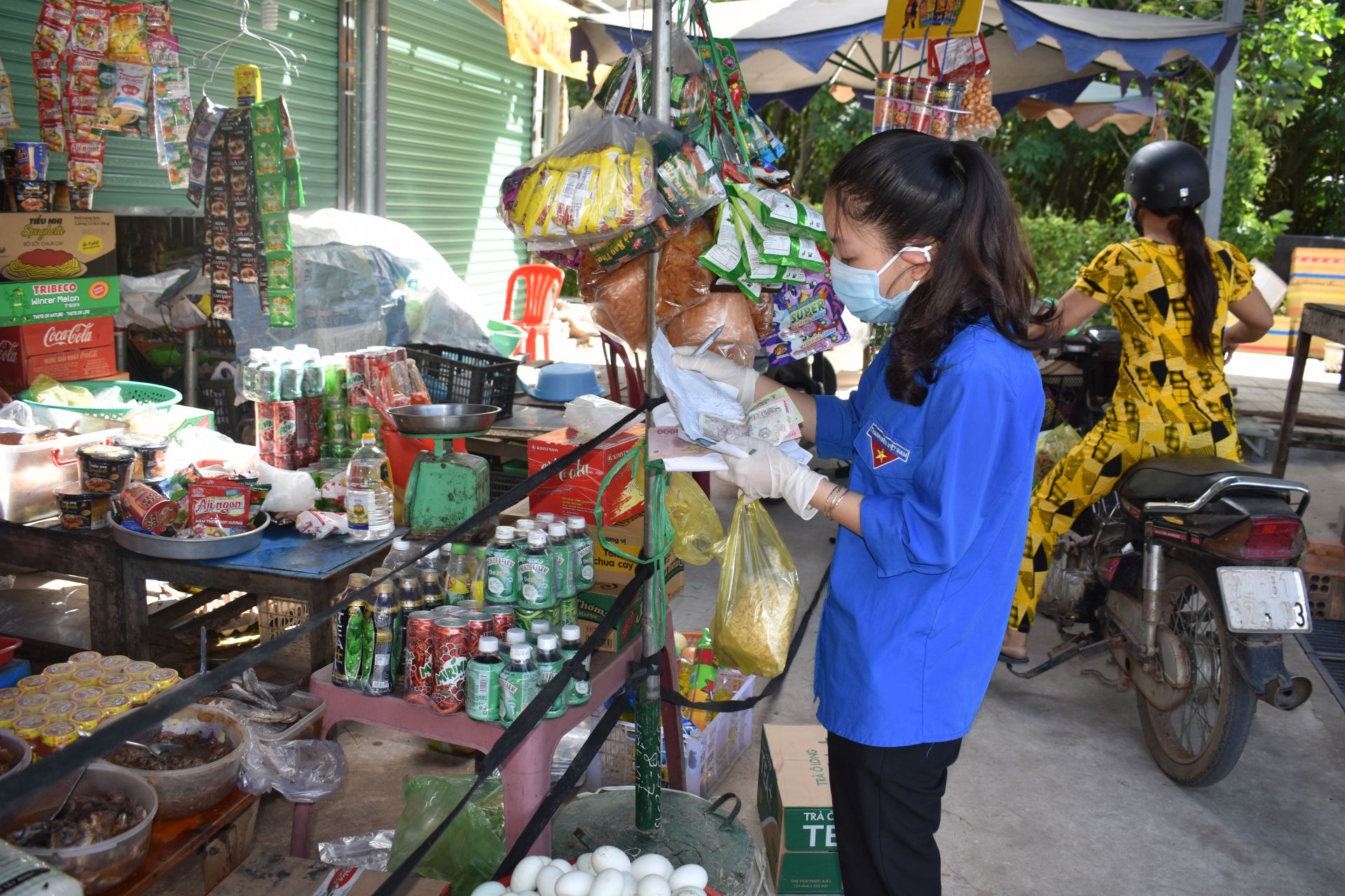 Tình nguyện viên đi mua nhu yếu phẩm giúp người dân khu vực phong tỏa tạm thời tại xã Phan