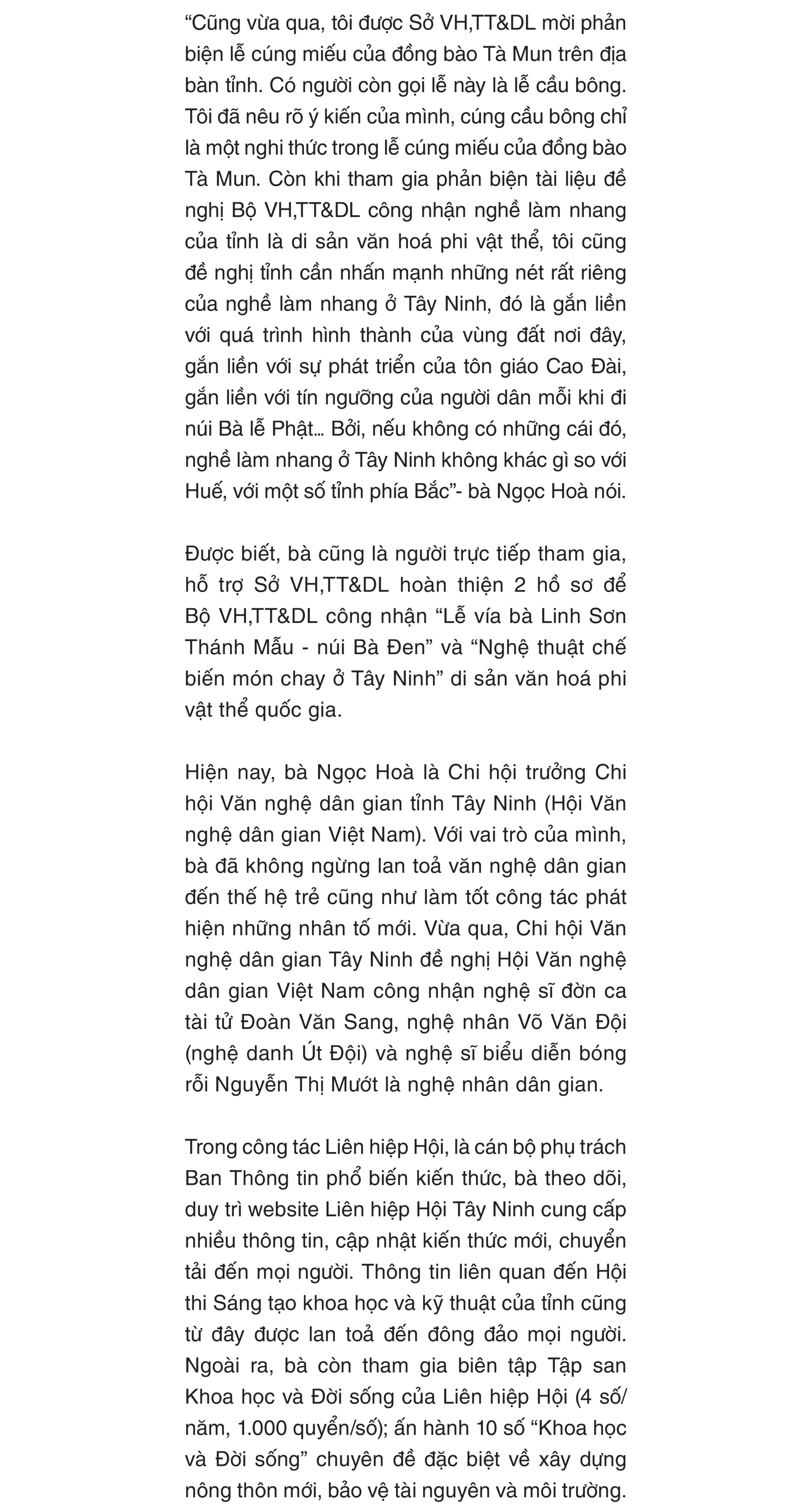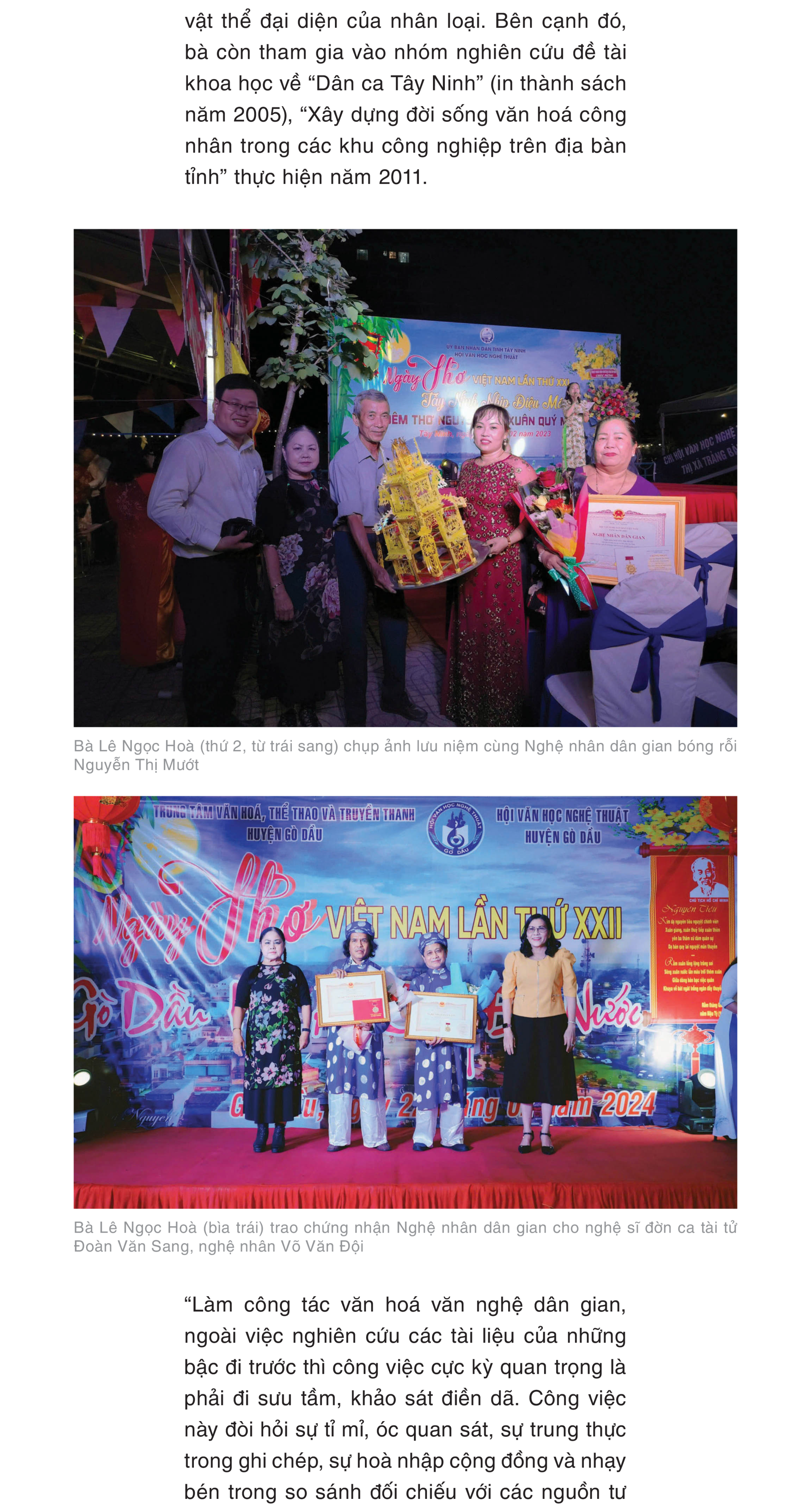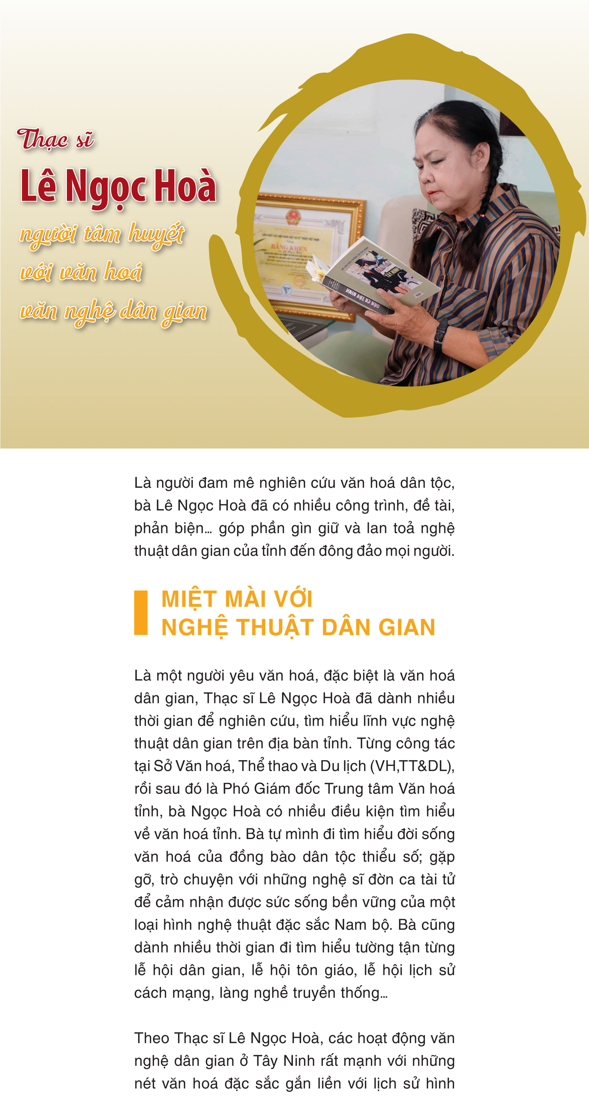 Đam mê nghiên cứu văn hoá dân tộc, bà Lê Ngọc Hoà đã có nhiều công trình, đề tài, phản biện… góp phần gìn giữ và lan toả văn nghệ dân gian của tỉnh đến đông đảo mọi người.