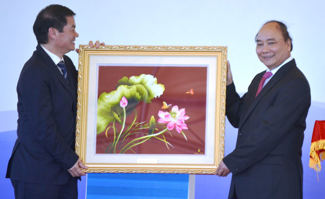 Thủ tướng Nguyễn Xuân Phúc trao quà lưu niệm cho đại diện Thaco tại lễ khởi công dự án - Ảnh: LÊ TRUNG