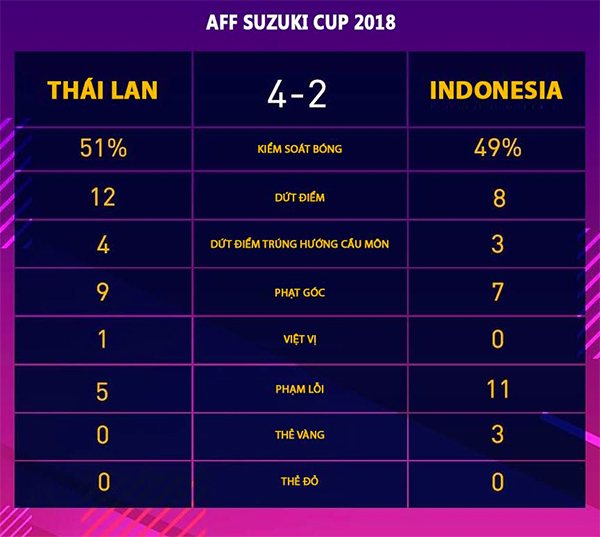 Nỗ lực của Indonesia khi Thái Lan có dấu hiệu chủ quan về cuối trận giúp đội bóng xứ vạn đảo rút ngắn cách biệt còn 2-4. Trung vệ đội trưởng Aryanto đánh đầu ghi bàn sau pha phạt góc. Nhưng đó là tất cả những gì Indonesia làm được trước khi rời sân với hai bàn tay trắng.