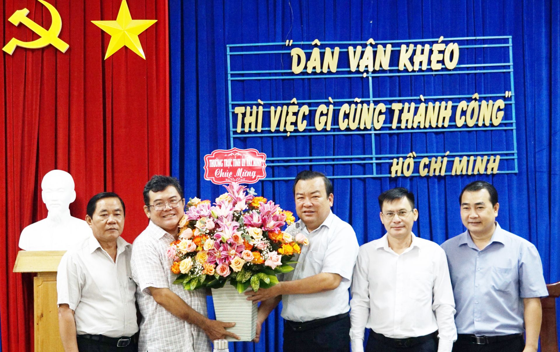 Phó Bí thư Thường trực Tỉnh uỷ Phạm Hùng Thái tặng hoa chúc mừng tập thể lãnh đạo, cán bộ, công chức Ban Dân vận Tỉnh uỷ.