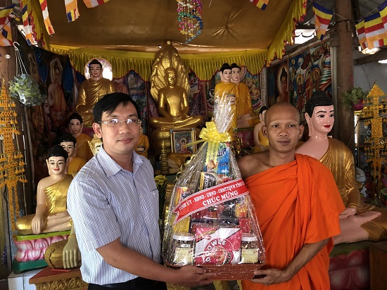 Ông Nguyễn Tiến Hưng- Uỷ viên thường trực UB.MTTQVN tỉnh tặng quà cho sư sãi Chùa Sát Rát.
