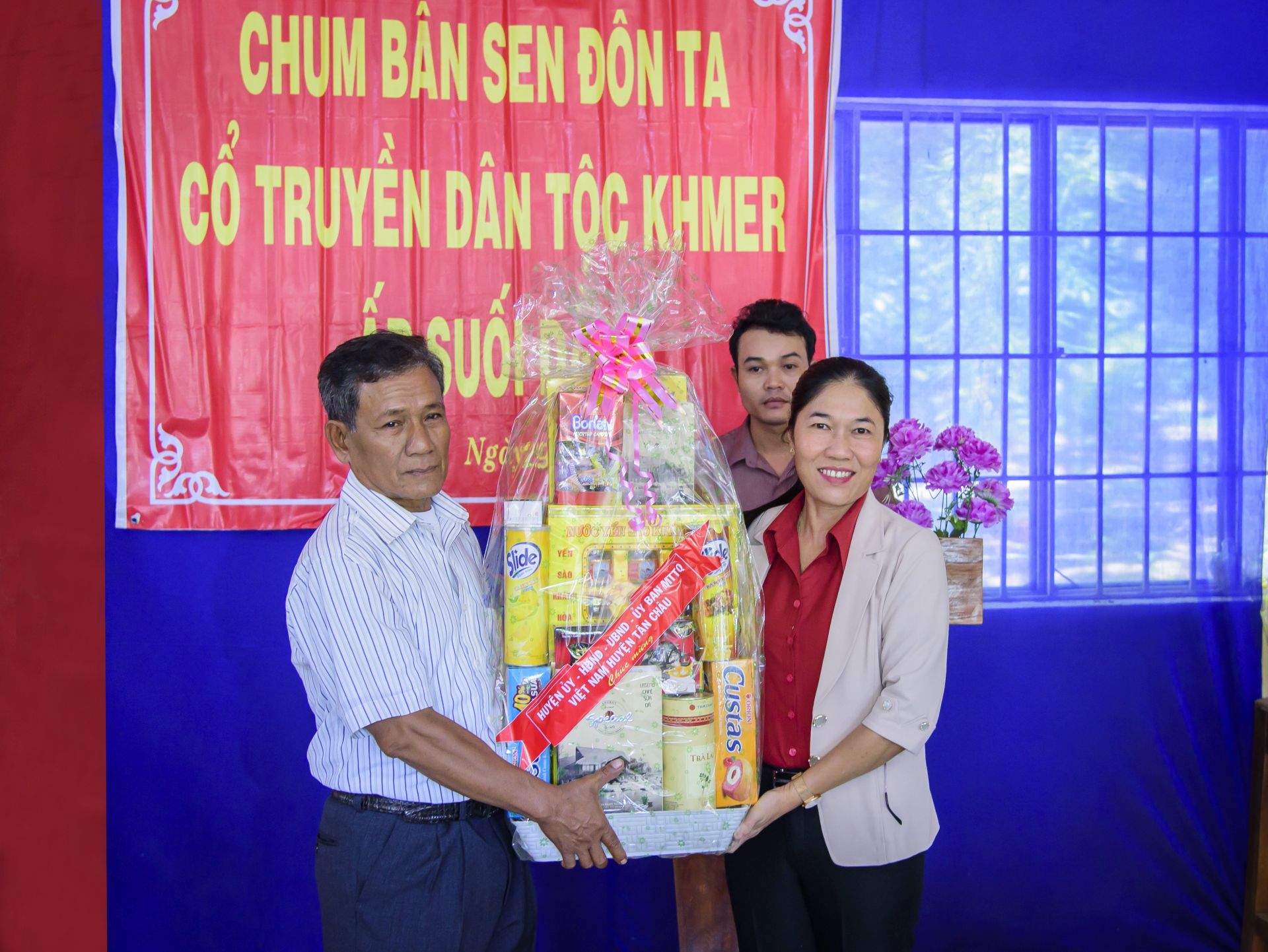 Phó Chủ tịch UBND huyện Tân Châu Nguyễn Thị Thành tặng quà chúc mừng lễ Sen dolta đồng bào Khmer ở ấp Suối Dầm.